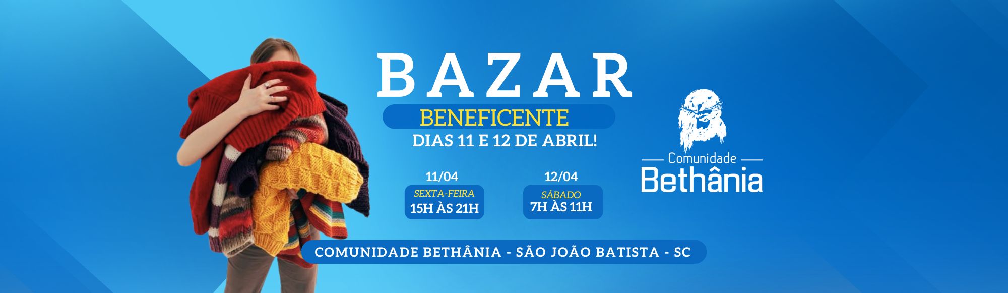 A Comunidade Bethânia, no recanto de São João Batista, Santa Catarina, realiza mais uma edição do Bazar Beneficente nos dias 11 e 12 de abril. O evento acontece no Centro de Eventos Padre Léo, o Leozão, localizado na Estrada Municipal Bethânia, nº 400, bairro Timbezinho.