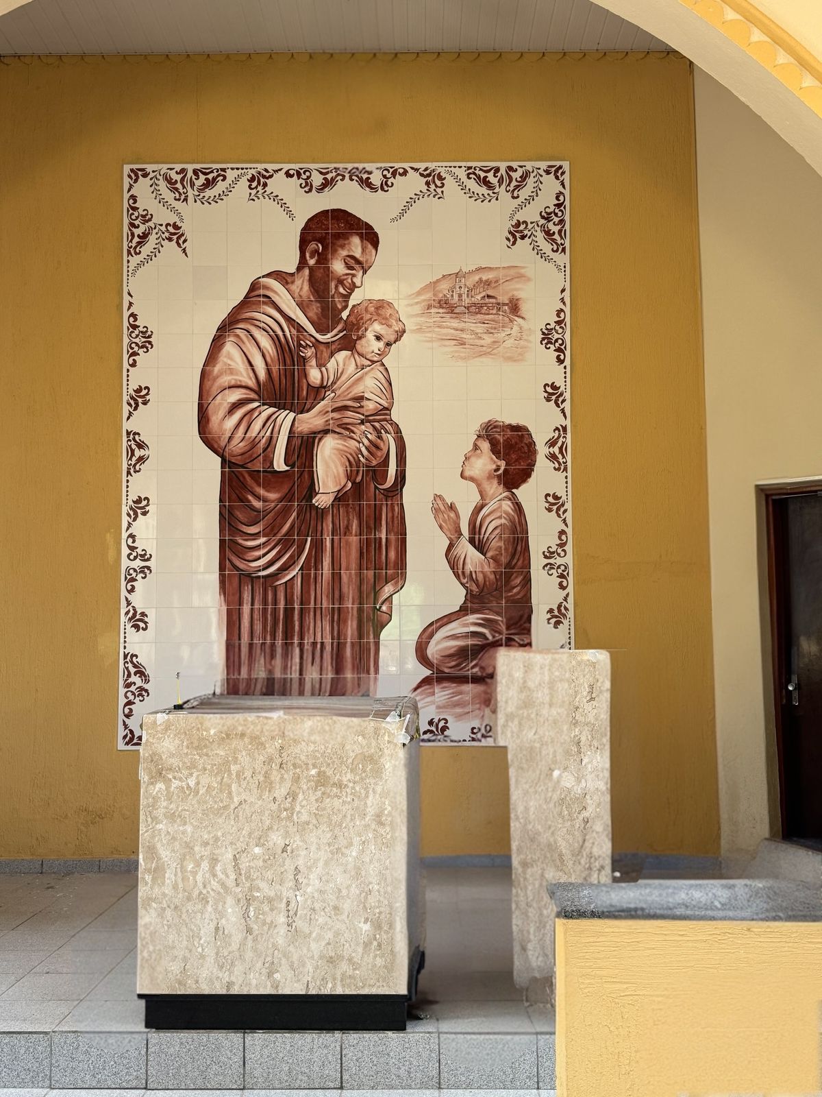 A iniciativa contempla uma obra de arte na parte interna da igreja, composta por azulejos pintados à mão e queimados em alta temperatura, retratando Padre Léo ainda menino, em cima de uma pedra onde costumava subir para “rezar missas”, já se imaginando sacerdote. Ao lado, estão representados São Benedito com o Menino Jesus no colo, o Biguá antigo e a paisagem da época, inspirada em uma fotografia antiga cedida por uma moradora local.