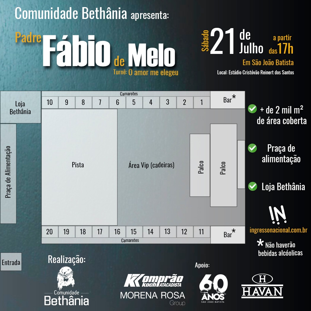A Comunidade Bethânia já conta os dias para o show do Padre Fábio de Melo, em 21 de julho, em São João Batista. Todos os preparativos estão sendo pensados para acolher o público. A estimativa é receber cerca de 5 mil pessoas.